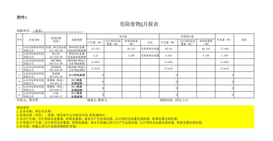 興辰鋁業危險廢物4月報表