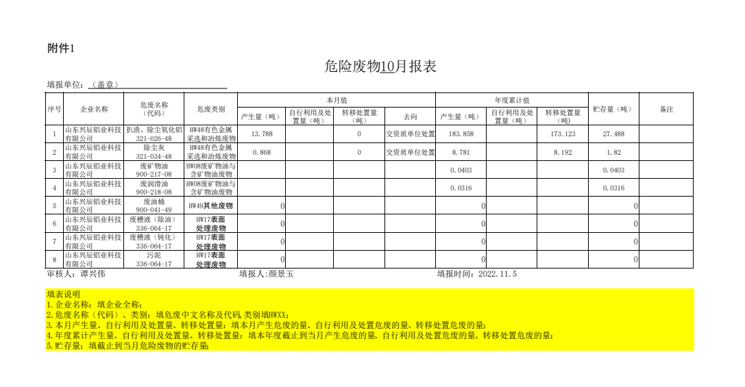 興辰鋁業(yè)危險(xiǎn)廢物10月報(bào)表