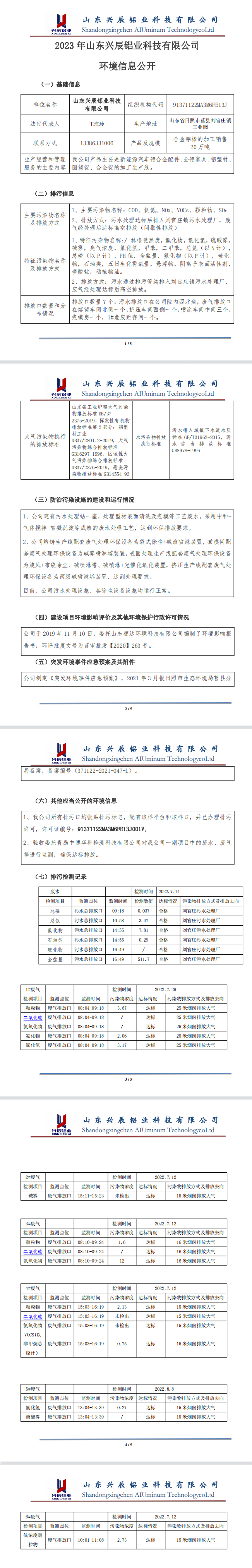 2023年山東興辰鋁業科技有限公司環境信息公開