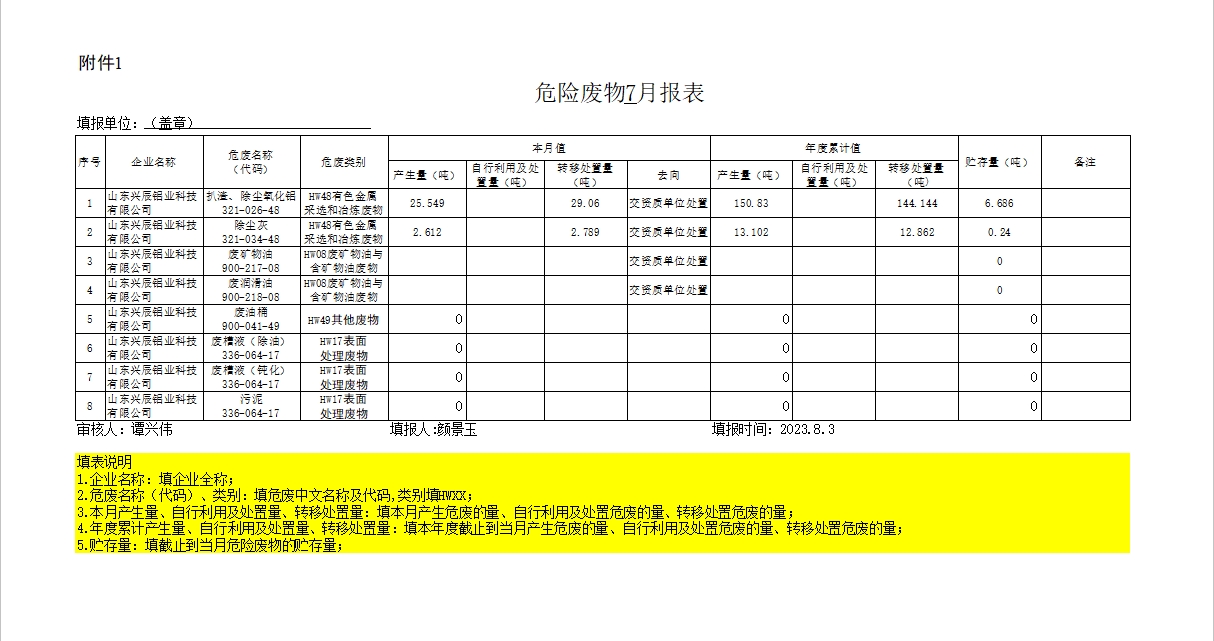 興辰鋁業(yè)危險廢物7月報表